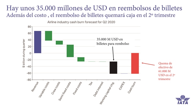 Por otro lado, además de los costes que todo esto está suponiendo, se estima que las compañías aéreas tienen que devolver unos 35.000 millones de dólares de billetes que los usuarios se han visto imposibilitados o no han querido utilizar (Cuadro 7). Muchas compañías –la mayoría– están intentando que, en vez de devolver el dinero, entregar bonos para que el pasajero los utilice de aquí a diciembre en cualquier ruta.Como resumen total, la IATA estimaba el 24 de marzo que las aerolíneas pueden ver desaparecer en este segundo trimestre del año del orden de 61.000 millones de dólares por toda esta situación (Cuadro 8).