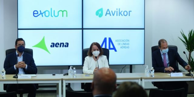 El consejero delegado de Exolum, Jorge Lanza, junto con la directora de Innovación, Sostenibilidad y Experiencia Cliente y CGO de Aena, Amparo Brea y el presidente de ALA (Asociación de Líneas Aéreas), Javier Gándara, han presentado en Barcelona la plataforma Avikor que ofrece a particulares y empresas volar de forma sostenible al permitir reducir las emisiones de su vuelo utilizando combustible sostenible de aviación (SAF).
