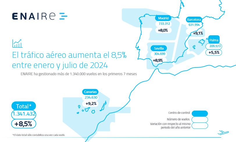 ENAIRE, gestor nacional español de navegación aérea, ha gestionado más de 1,3 millones de vuelos (1.341.432) en los primeros siete meses del año, lo que supone el 8,5% más que en el mismo periodo del año récord 2023. Se trata del enero-julio con más tráfico de la historia y la previsión es que 2024 sea un nuevo año récord.