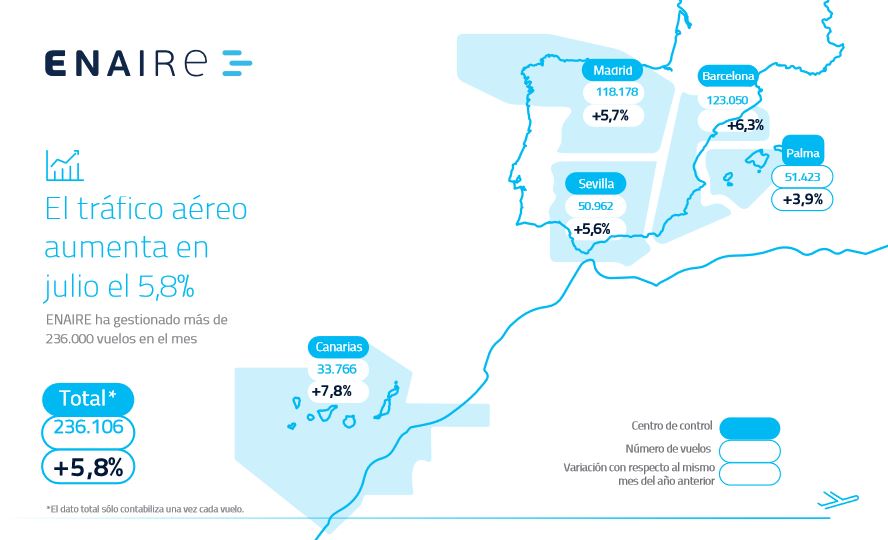 Todos los centros de control de ENAIRE aumentan en julio en número de vuelos gestionados. Destacan Canarias con 33.766 vuelos (+7,8%); Barcelona con 123.050 (+6,3%) y Madrid con 118.178 (+5,7%).