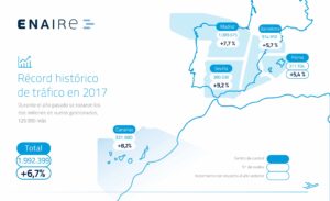 Enaire, la empresa del Grupo Fomento que gestiona la navegación aérea en España, ha culminado un 2017 histórico, con 1.992.399 vuelos, 126.000 más que en 2016. El crecimiento anual del 6,7 por ciento ha sido muy superior al que se ha registrado de media en Europa, que se ha situado en el 4,1. Del total, 1.189.806 fueron internacionales (6,9 por ciento más); 390.461 domésticos (4,9) y 412.132 sobrevuelos (8,2). Los meses con más movimiento gestionados fueron julio y agosto, registrando una cifra superior a 209.000 en cada caso. El tráfico aéreo en nuestro país lleva encadenados más de cuatro años de crecimiento ininterrumpido, a un ritmo que ha hecho posible que España adelante a los Estados Unidos y se convierta en el segundo destino turístico mundial, con 82 millones de turistas internacionales en 2017.