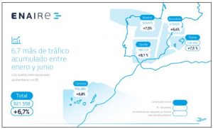 Enaire ha gestionado 921.558 vuelos en el primer semestre de este año, 58.000 vuelos más que en mismo período de 2016. El crecimiento del 6,7 por ciento prácticamente dobla la media europea, del 3,5. Del total, 544.637 han sido internacionales, un 8 por ciento más; los nacionales ascendieron a 183.677 (1,8 por ciento); y los sobrevuelos (que no tienen origen ni destino en un aeropuerto español) superaron los 193.000 (8,1). Sube el número en todos los centros de control: Sevilla (8,1 por ciento y 180.773 vuelos), Madrid (7,5 y 523.515), Palma (7,5 y 126.345), Canarias (6,8 y 159.285) y Barcelona (6,4 y 413.623).