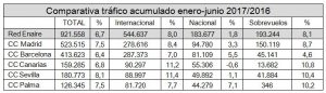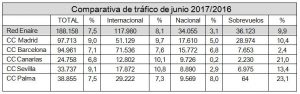 En junio gestionó 188.158 vuelos, un 7,5 por ciento más que en el mismo mes de 2016. Son 46 meses encadenados de crecimiento ininterrumpido del tráfico aéreo. Los internacionales en junio han sido 117.980, un 8,1 por ciento más que en mismo mes de 2016; los nacionales 34.055 (3,1) y los sobrevuelos 36.123 (9,9). El tráfico creció el pasado mes en todos los centros de control: Sevilla (9,1 por ciento y 33.737 vuelos), Madrid (9 y 97.713), Palma (7,5 y 38.855), Barcelona (7,1 y 94.961) y Canarias (6,8 y 24.758).