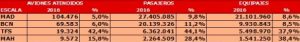 Iberia Airport Services atendió en 2016 a cerca de 90 millones de pasajeros, tanto del Grupo Iberia como de otras 200 aerolíneas clientes, lo que supone un incremento de casi un 9 por ciento respecto al año anterior. El año pasado prestó servicios de “handling” a más de 340.000 aviones -un 4,6 por ciento más-, y gestionó más de 57 millones de maletas, también un 6,7 por ciento más que en 2015. En Madrid, atendió a cerca de 27,5 millones de pasajeros –casi un 10 por ciento más que en 2015-, cerca 105.000 aviones y más de 21 millones de maletas; y en Barcelona superó la cifra de 20 millones de viajeros, atendió cerca de 70.000 aeronaves y gestionó casi 10 millones de equipajes. El mayor crecimiento, no obstante, se registró en aeropuertos como Tenerife-Sur ( 6,5 millones de pasajeros, un 44 por ciento más) o Menorca (2,2 millones y un 28,4), sobre todo por la incorporación del gigante turístico Thomas Cook a su cartera de clientes.