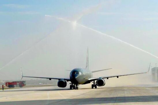 El presidente y su comitiva aterrizaron en Santa Lucía a las 09:12 de la mañana. El Boeing 737-800, matrícula 3527, perteneciente al Escuadrón Aéreo 502 (Orcas), taxeó hasta ubicarse en la plataforma de la FAM, frente a los 11 hangares que forman parte de la infraestructura del AIFA. Antes de llegar a su posición final, a aeronave pasó por debajo del tradicional arco formado con chorros de agua a presión para ser bautizada junto con las instalaciones de la terminal militar.