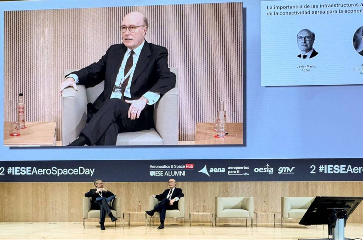 Javier Marín, vicepresidente ejecutivo de Aena, ha participado hoy en el II AeroSpace Day organizado por el IESE Business School, con una intervención centrada en la importancia de la red aeroportuaria de Aena y de la conectividad aérea para la economía española.