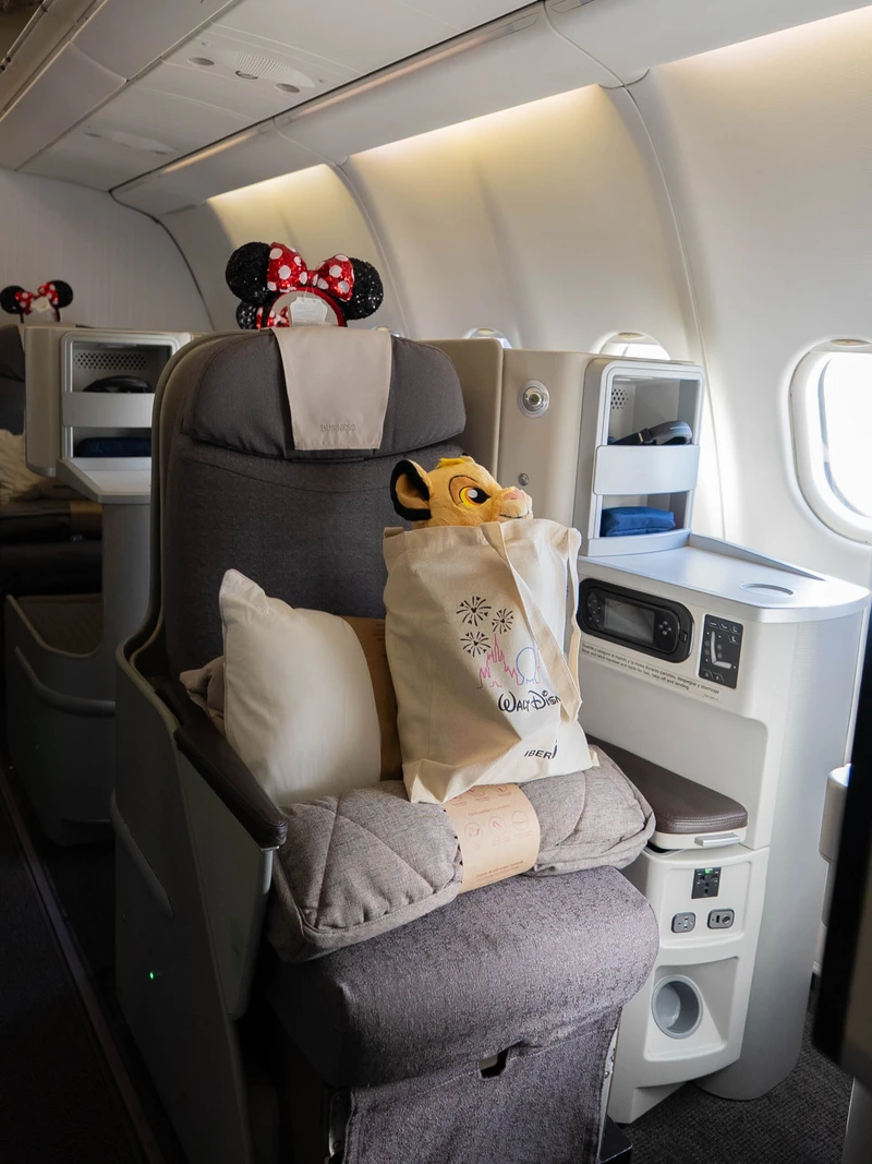 Asientos del vuelo inaugural entre Madrid y Orlando decorados con motivos de Walt Disney World. Foto: Iberia.